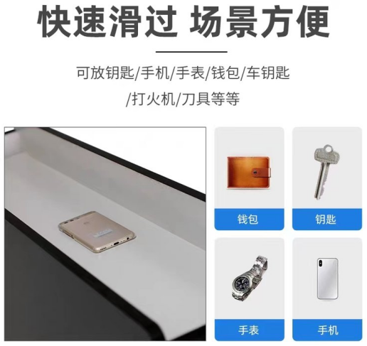 特点:针对允许带入的白名单物品(对讲机、警用装备等),使用过程:检测物品可通过放置传送,被测人员通过手机检测门后即可取回。